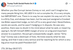 President Donald Trump lit up social media with an early-morning scorched-earth rant over the indictment of “Dirty Cop” James Comey, saying the disgraced ex–FBI chief had finally dug his own grave, figuratively speaking of course.